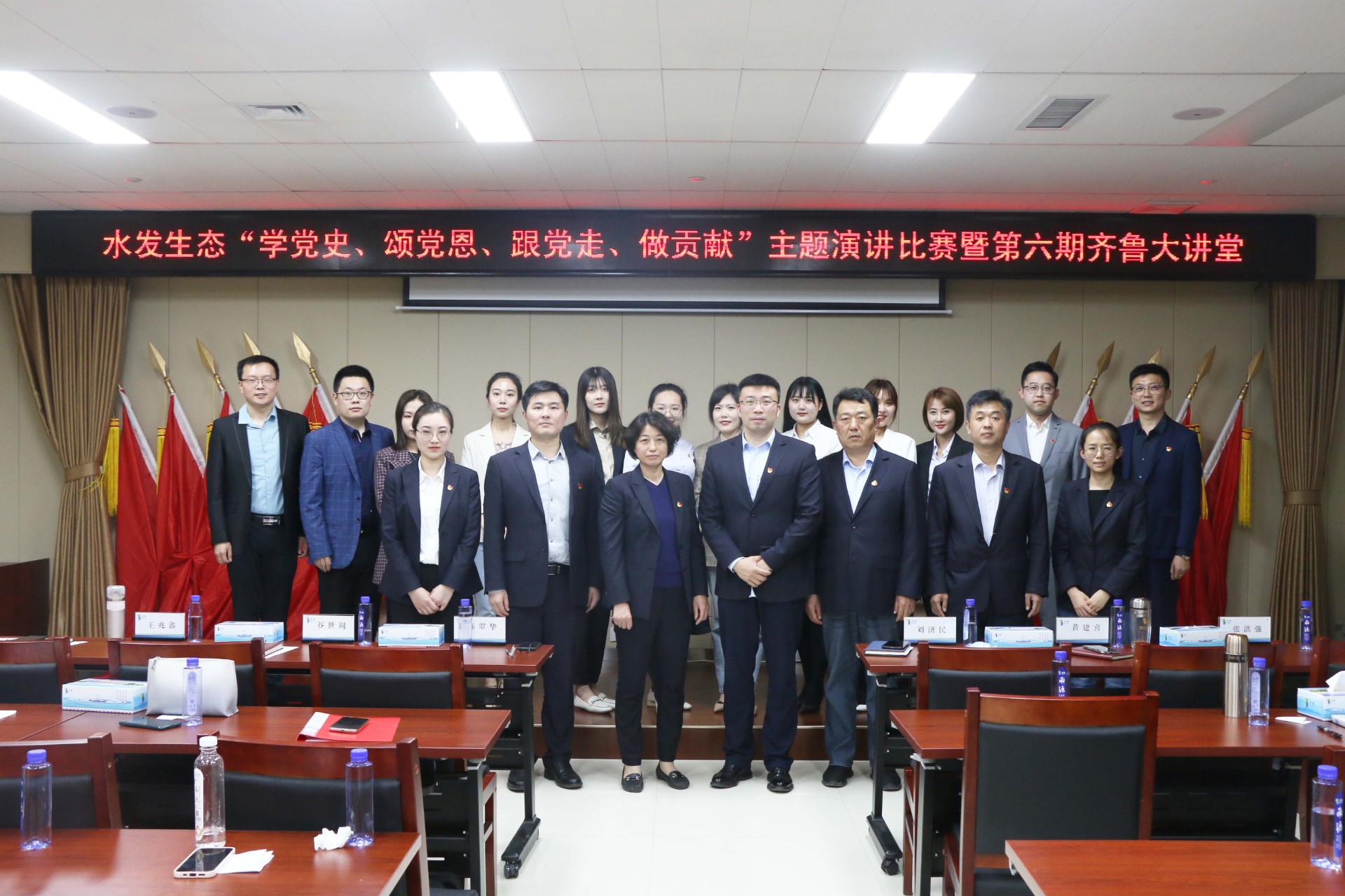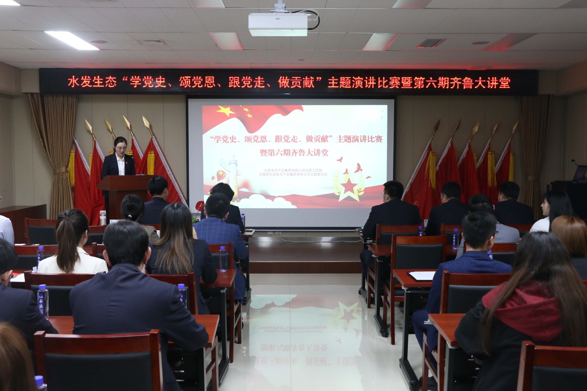 本次比赛自4月初以来进行了宣传、选拔等环节,最终有12名选手顺利进入比赛名单。现场,选手们结合正在开展的党史学习活动,联系即将到来的青年节,配合着精心制作的幻灯片、背景音乐,或激昂高亢、或低沉吟诵,歌颂了党的丰功伟绩,回顾了集团成立的艰辛历程,抒发了对党、对祖国、对水发生态的热爱之情,表达了“跟党走、做贡献”的坚定信念。选手们个个激情澎湃,整场比赛精彩纷呈,赢得了评委及观众的阵阵掌声。