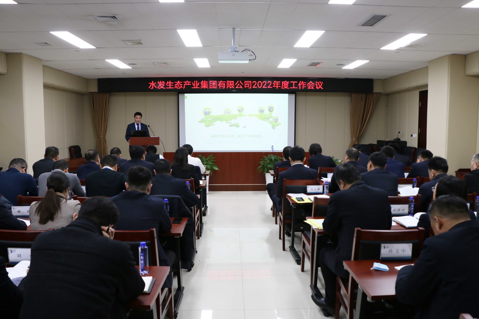 会议总结回顾2021年工作情况,水发生态在水发集团党委的正确领导下,紧紧围绕“四大战略”“四大攻坚”和“四大提升”工作部署,以稳中求进保持良好状态,以改革创新增强发展动能,各级权属企业团结拼搏、逆势奋进,集团总体呈现出主业发展更加稳健、产业结构更加清晰、管理效能更加提升的良好局面。