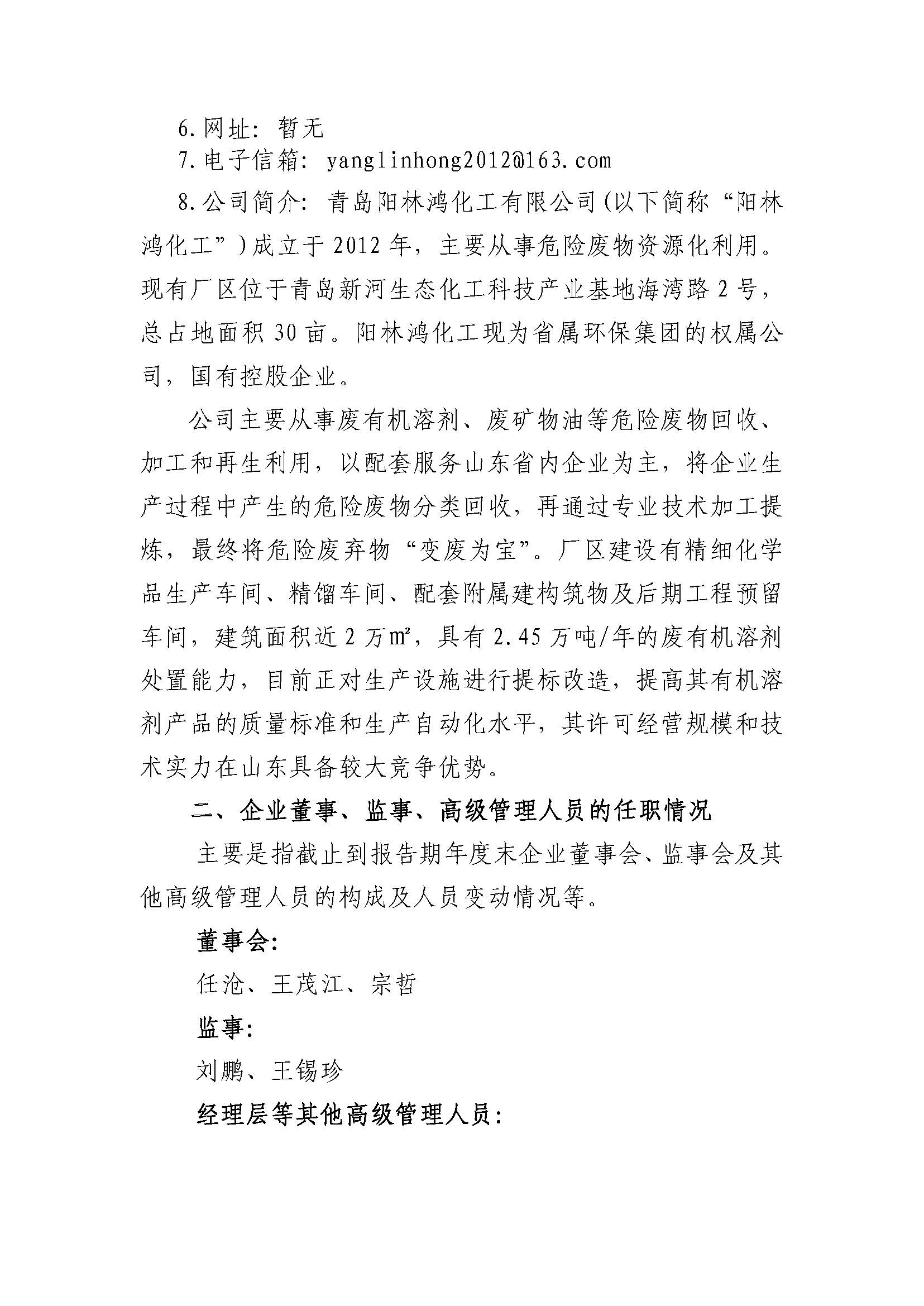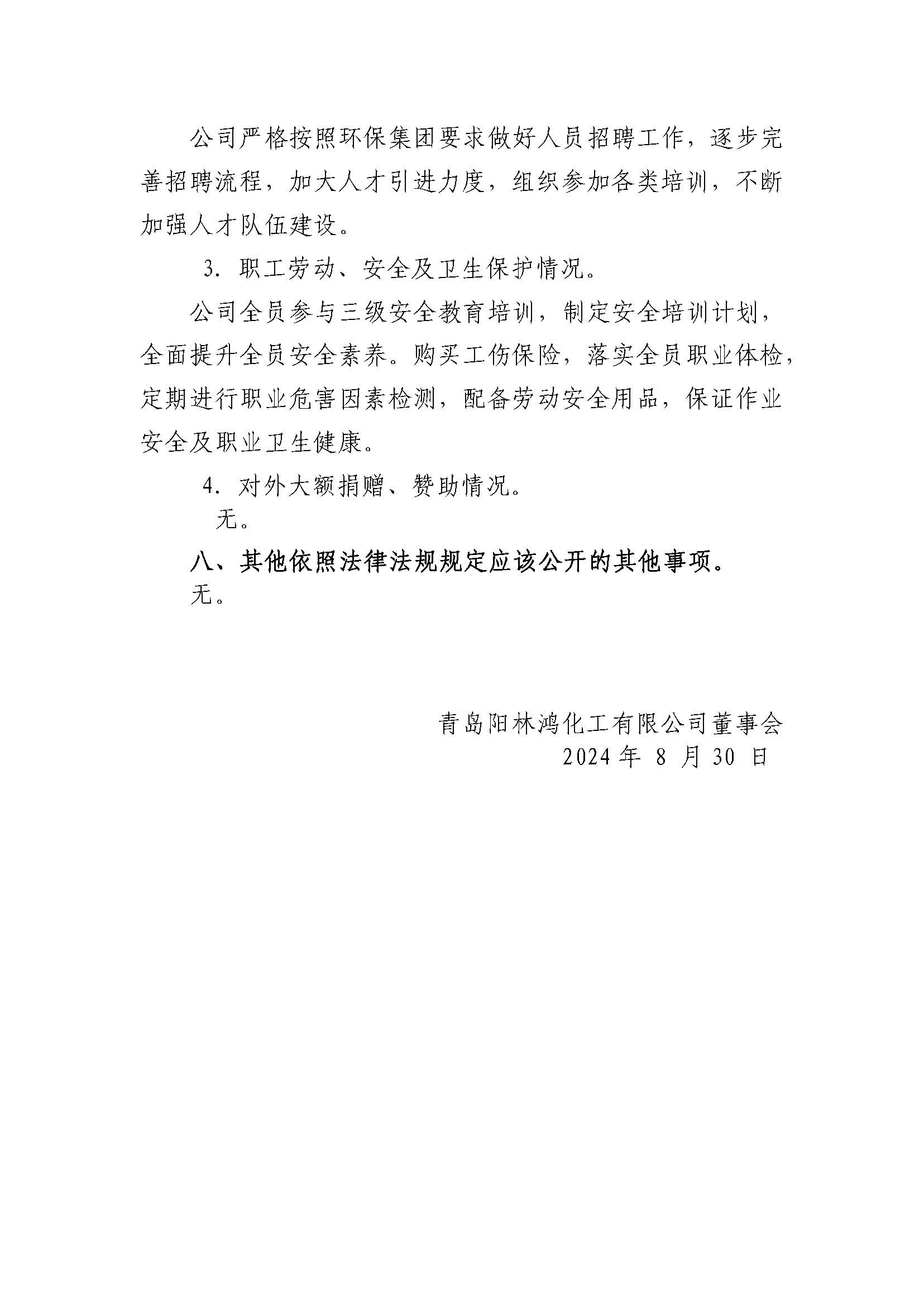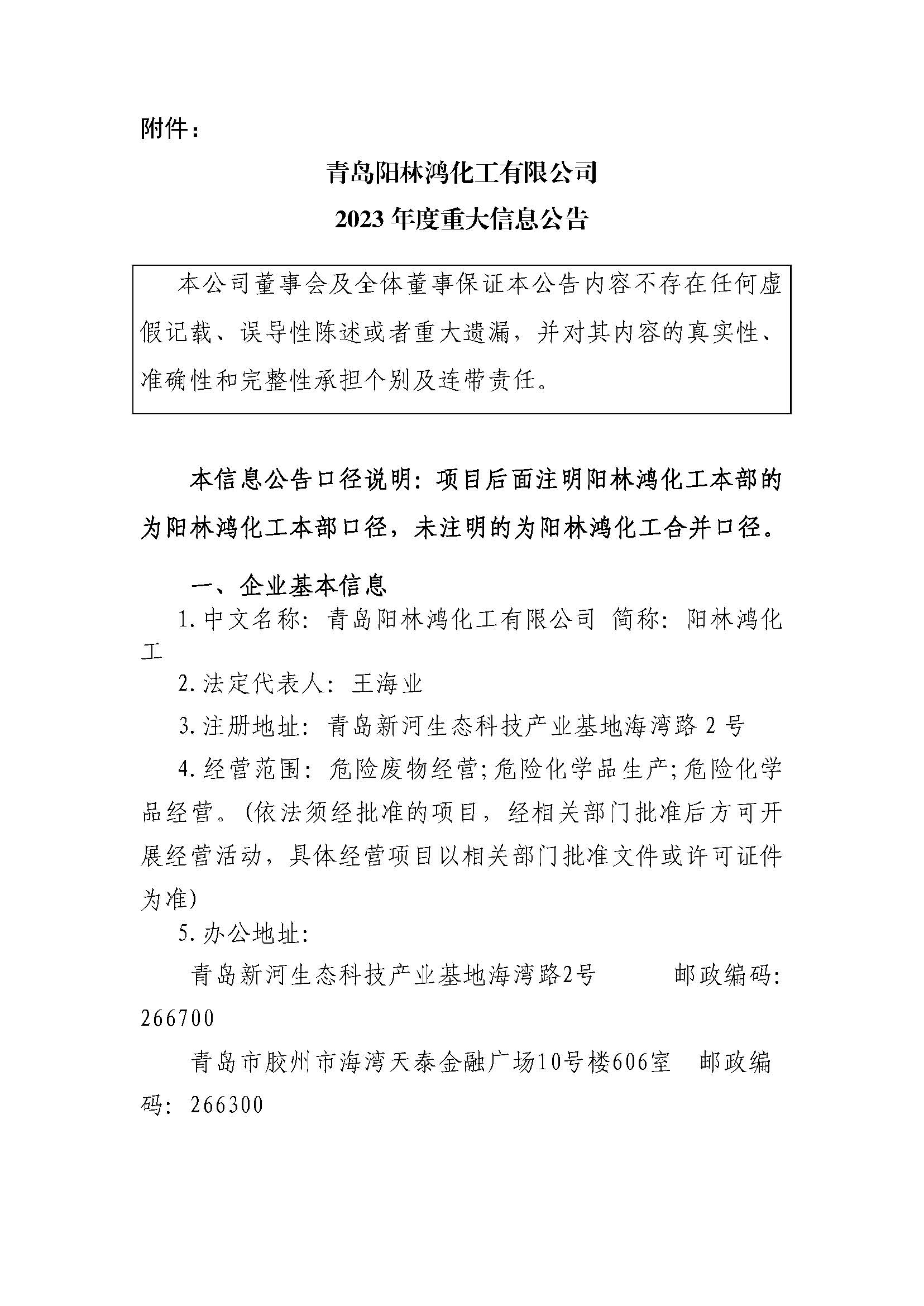 青岛阳林鸿化工有限公司2023年重大信息公告