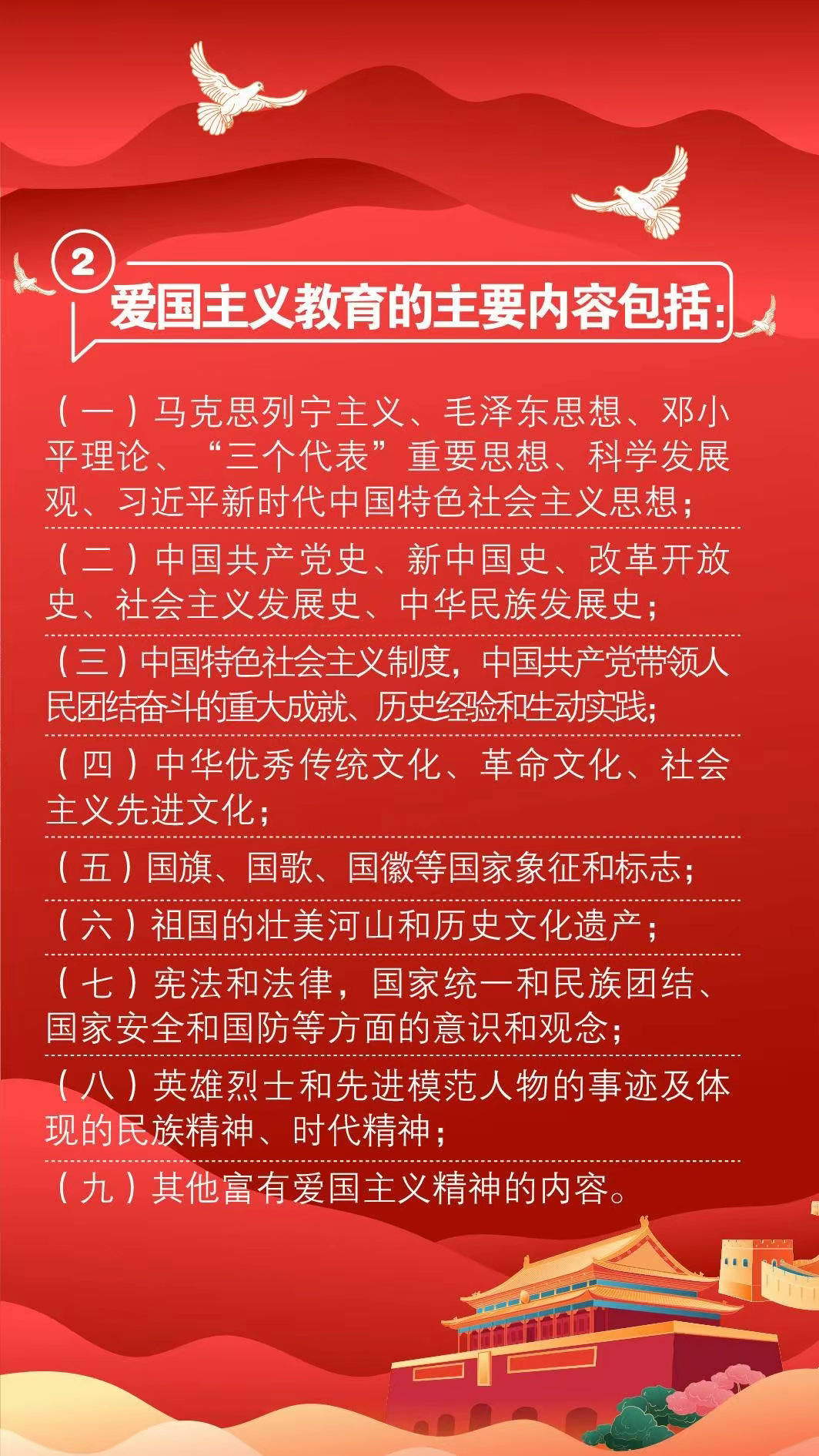 这部旨在加强爱国主义教育、传承和弘扬爱国主义精神的法律, 规定了爱国主义教育的主要内容,以法治方式推动和保障新时代爱国主义教育,对于振奋民族精神、凝聚人民力量,推进强国建设、民族复兴,具有十分重大而深远的意义。