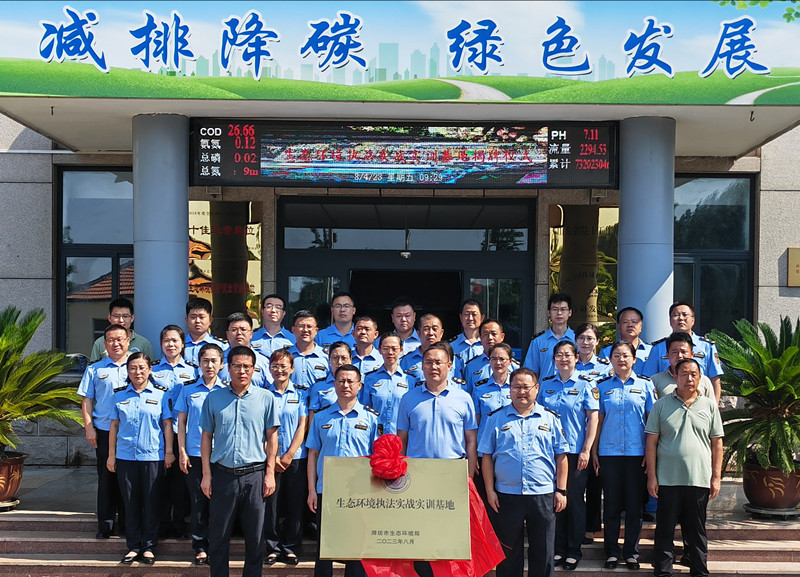 8月4日上午,潍坊市生态环境执法实战实训基地率先在昌乐蓝宝石水务发展有限公司(以下简称“昌乐水务”)正式挂牌,市局党组成员、支队长于宝生,昌乐分局党组书记、局长张永生,昌乐分局党组成员、大队长高春平,昌乐水务总经理助理刘建文共同为实战实训基地揭牌。