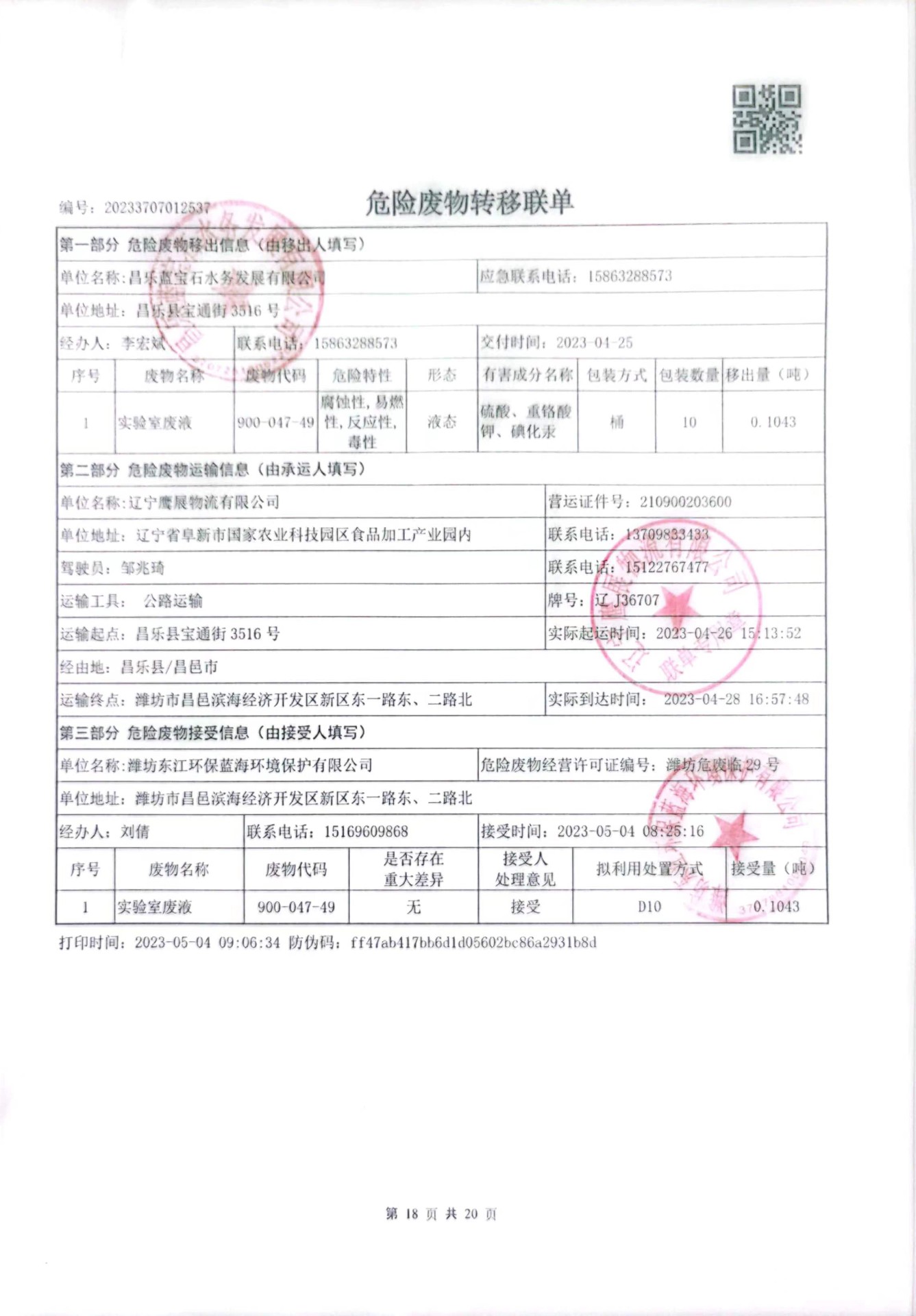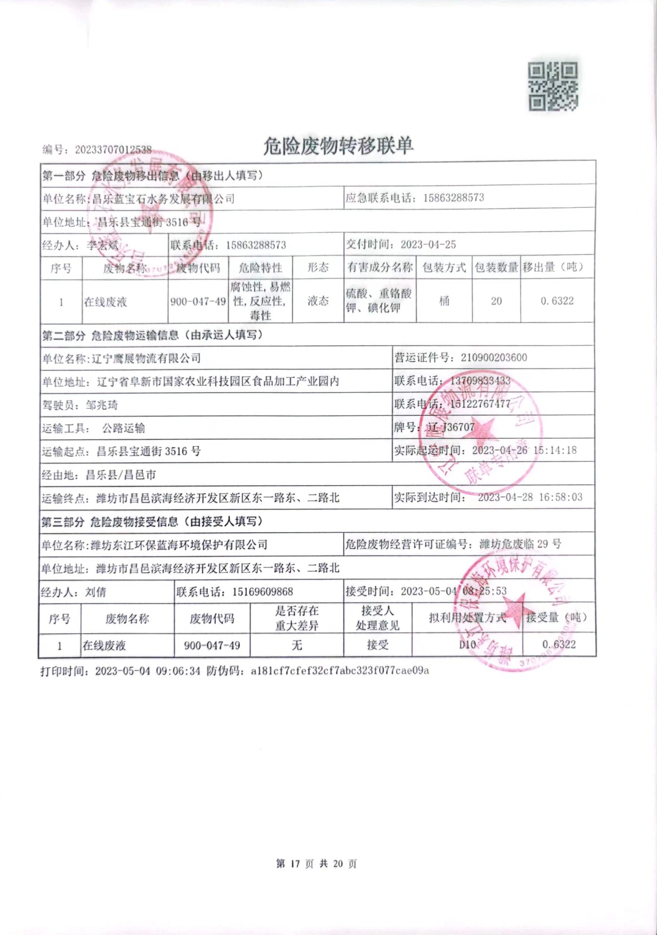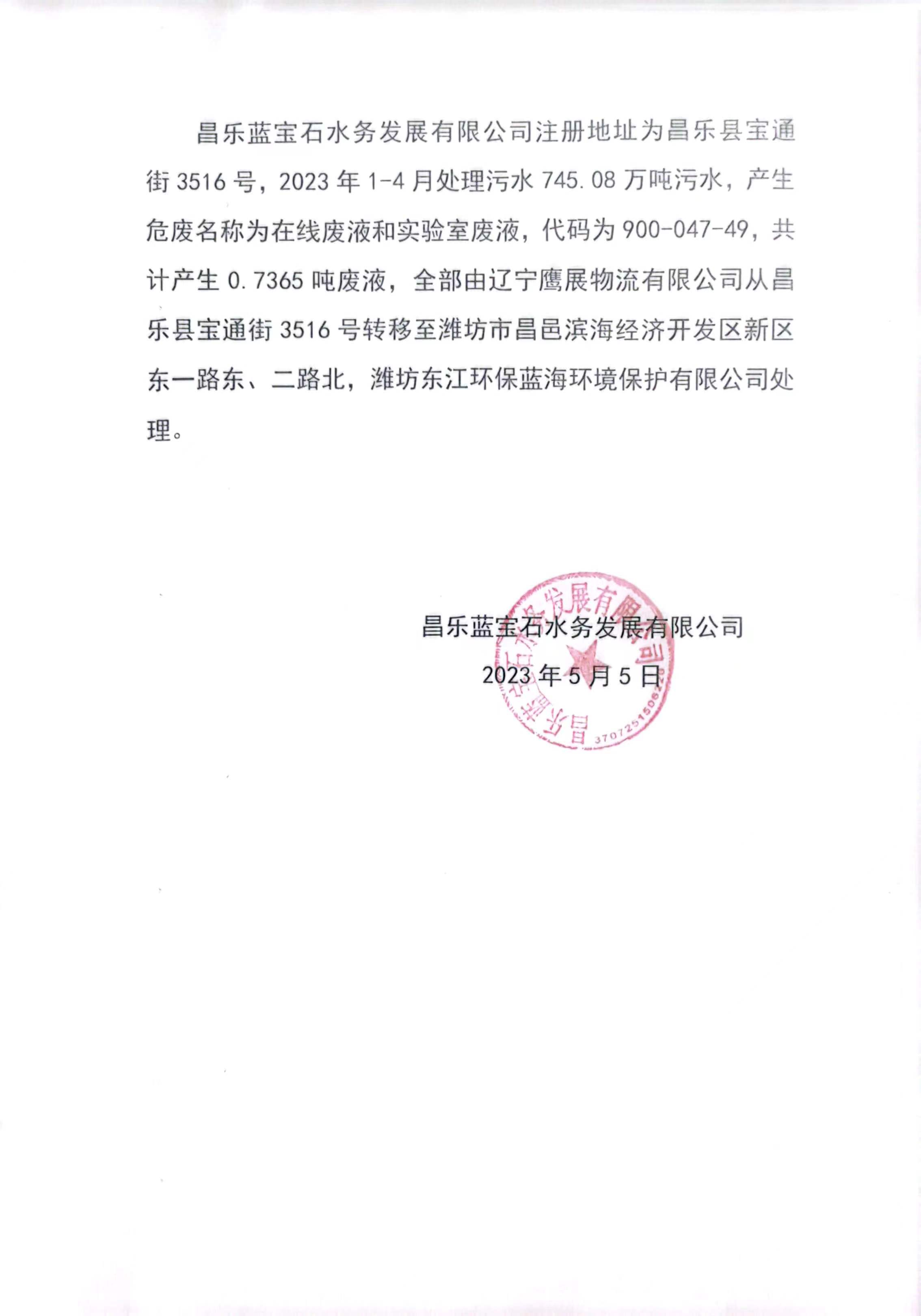 昌乐蓝宝石水务发展有限公司注册地址为昌乐县宝通街3516号,2023年1-4月处理污水745.08万吨污水,产生危废名称为在线废液和实验室废液,代码为900-047-49,共计产生0.7365吨废液,全部由辽宁鹰展物流有限公司从昌乐县宝通街3516号转移至潍坊市昌邑滨海经济开发区新区东一路东、二路北,潍坊东江环保蓝海环境保护有限公司处理。